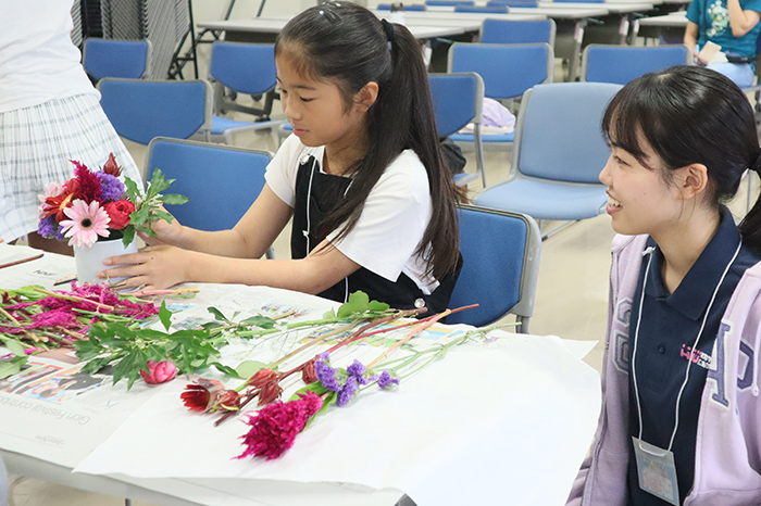 アレンジメント体験をする児童を笑顔でサポートする学生(右)(撮影・山北)