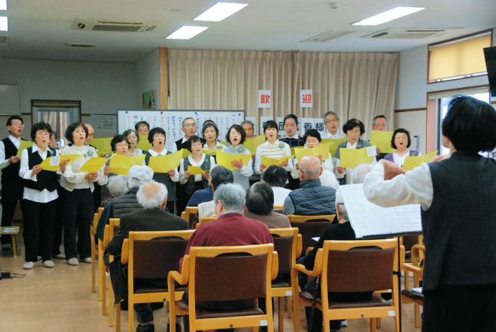 東広島市高屋町中島の西品寺合唱団「真養」が3月20日、同町大畠の成寿会デイサービスセンター高屋で、歌やハンドベルなどを披露した。利用者と一緒に踊れるオリジナルの曲もあり、会場を盛り上げた。