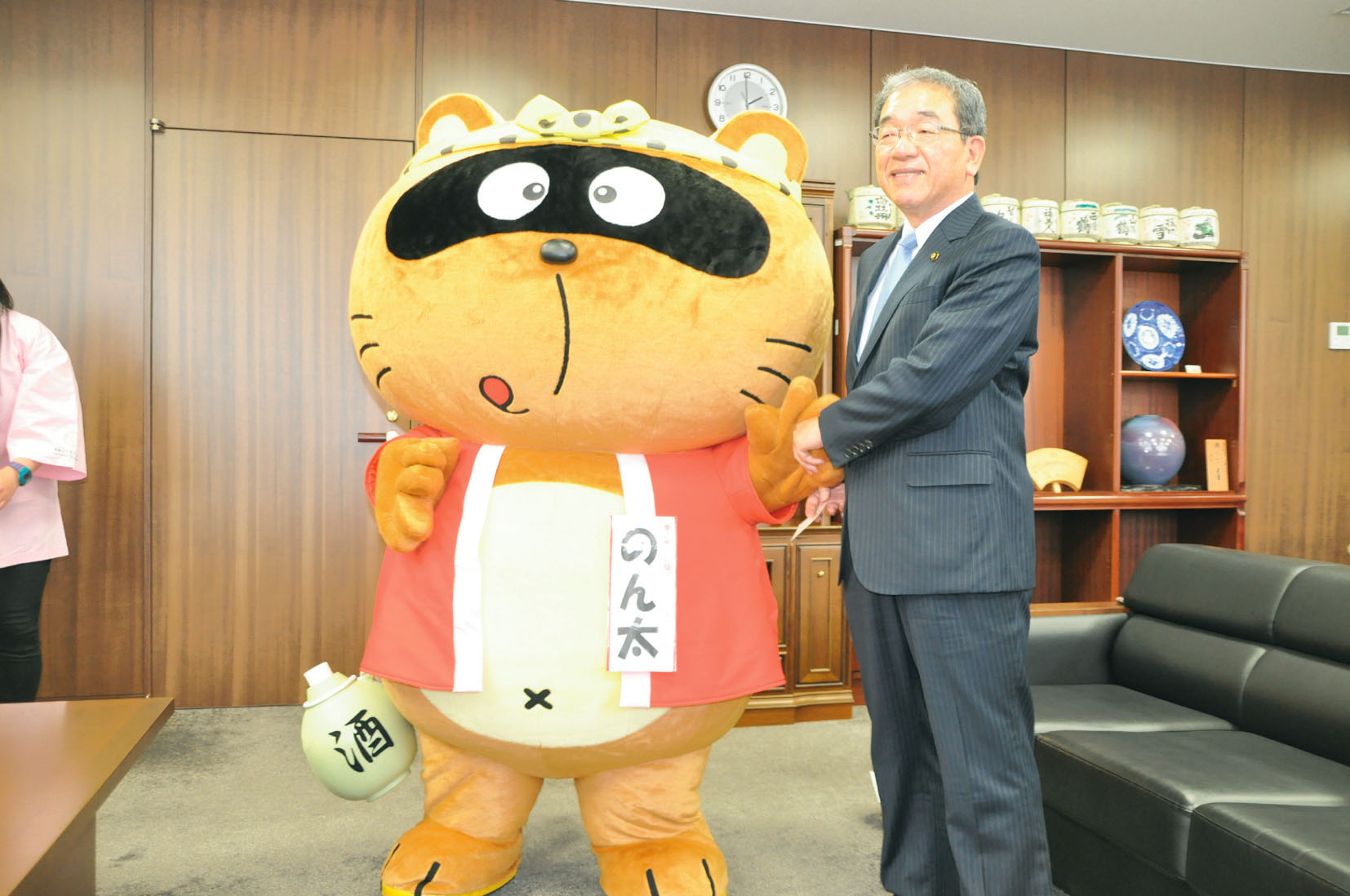 高垣市長と初対面したのん太は、観光特命大使としての取り組みを紹介。高垣市長は「酒都西条の名をさらに全国にアピールしてほしい。東広島に住みたい、働いてみたいと思ってもらえるような街づくりに一生懸命取り組みたいので、のん太くんにも協力してほしい」と話した。