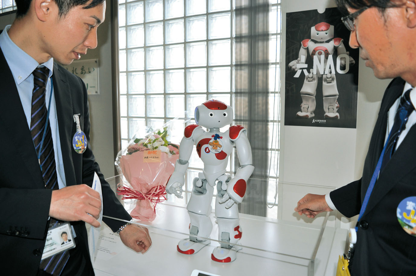 JA広島中央はこのほど、西条支店(西条栄町)と高屋支店(高屋町杵原)にコンパニオンロボット「西条つなぎ君」と「高屋つなぎ君」をそれぞれ配属した。県内のJAでは初めて。つなぎ君は、フランスのアルデバラン・ロボティクス社(ソフトバンクグループ)製の自立型ヒューマノイドロボット「NAO(ナオ)」で、身長58㎝。プログラムのカスタマイズが可能で、カメラ、マイクなどを通してコミュニケーションを取ることができる。NTTドコモの、人工知能(AI)を活用した対話サービス「自然対話エンジン」を導入し、簡単な会話を楽しむことができめる。