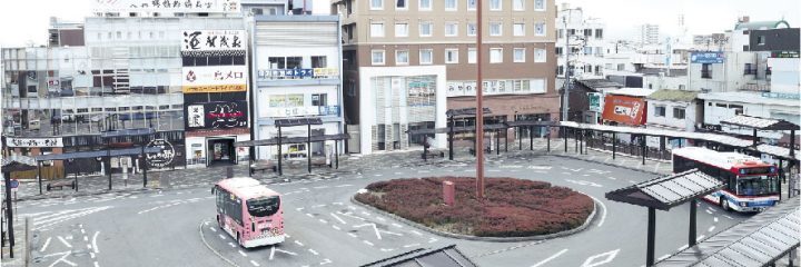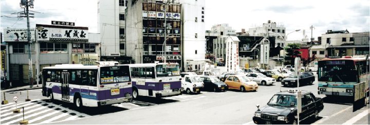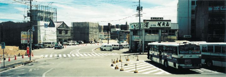 このロータリーの出入り口は、西に中央通りへ続く比較的広い道と東に狭い道の2カ所があったが、広い道はふさがり、狭い道はブールバールとなり、様相は一変した。写真に写っている広場は、かつてバス、タクシー、マイカーの三者が共同で使っていたが、今はバス専用の発着、待合場所となっている。