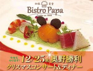 欧風食堂ビストロパパは今年もクリスマスコンサート&ディナーを開催します。シェフが食材にこだわり、腕によりをかけた料理を食べながら、奥野さんの独特の音楽の世界観へ誘います。心温まる音楽と食の融合をぜひ、ビストロパパで体感してください。