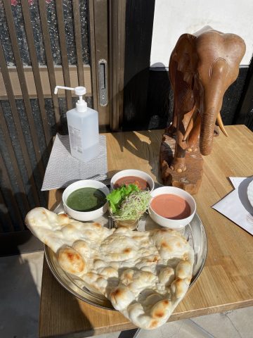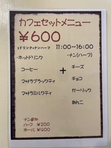 ドリンクとナンのカフェセットメニュー。あんこナンが気になります。カフェタイムにも気軽に利用できるようにとカフェメニューを始めたそうです。
