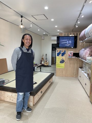 今井屋寝装品店は、寝装・寝具の販売だけでなく、オーダーカーテン、インテリア・内装リフォーム、音響機器レンタル・オペレート などの事業内容。音楽教室まであるんです!どうりで・・・店舗にお邪魔すると、ギューンとギター音の鳴り響くミュージックビデオが流れていました。