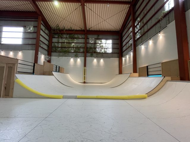 中に入ると、正面がパーク(スケートボード場)。外観のイメージ通り、倉庫っぽい造りの屋内に、ランプ(スノーボードのハーフパイプのような形)と呼ばれるセクションがあります。