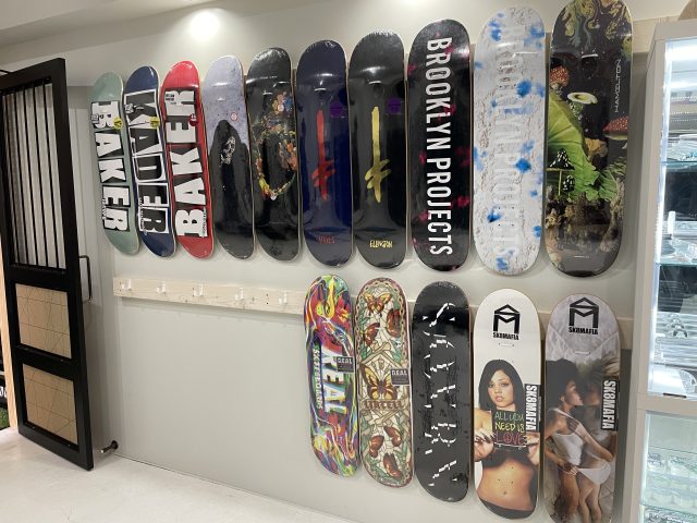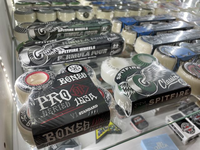パークの横にあるショップには、シューズやウェア、スケートボードを構成するデッキ(板)や、ウィール(タイヤ)、それを取り付けるパーツ等々が並んでいます。