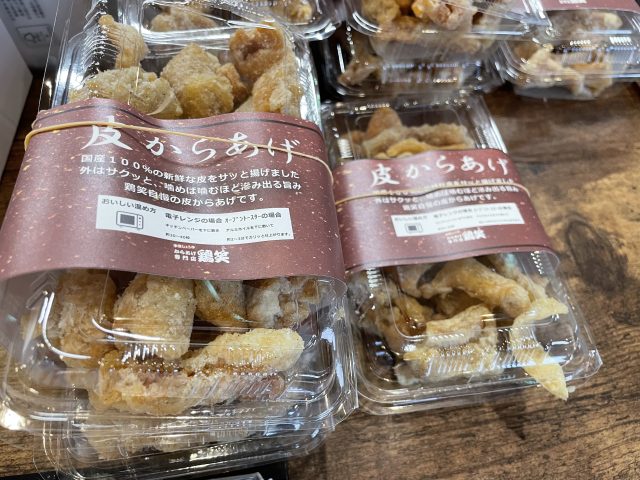 レジの側に並んでいた、鶏皮のからあげ。数量限定で販売しているそうです。外はサクっと、噛むとジュワっと手が止まらないおいしさでした。1パックにたっぷり入っているので、おつまみにいかがでしょうか。