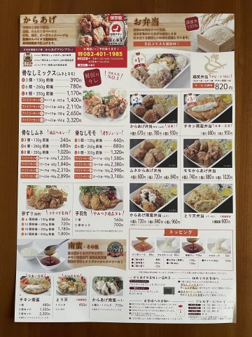 からあげは、骨なしミックス(ムネとモモ)、骨なしムネ、骨なしモモなど。S(3個)、M(6個)、L(8個)から選ぶことができます。9個以上は、個数によってファミリーセット(A~D)もあります。