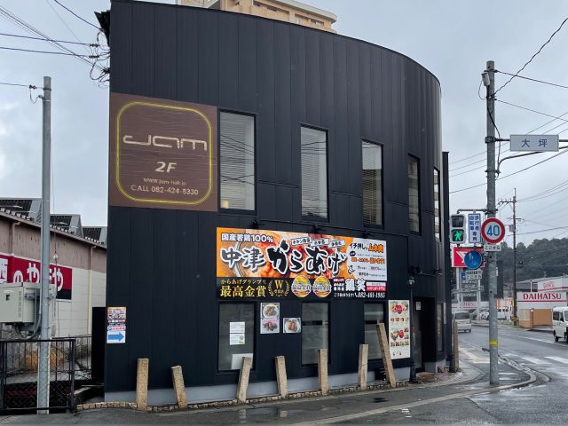 大坪交差点の角に建つ黒い壁の建物の1階です。
