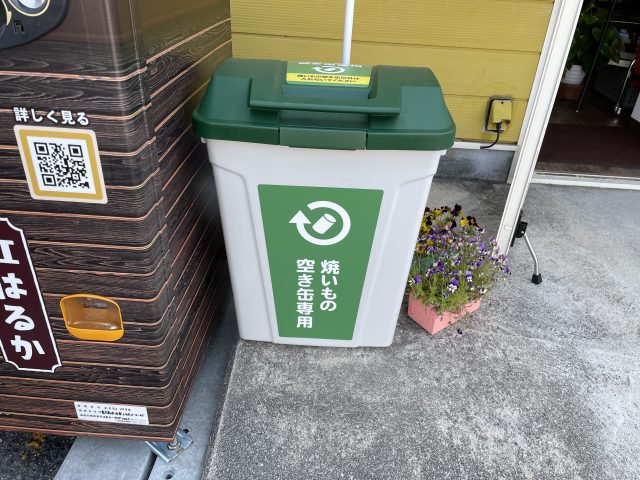 購入すると、ジュースの缶のような、筒形の透明なケースに入った熟成焼き芋(真空パック)が出てきます。缶型のケースは自動販売機の横にある、回収ボックスに入れて返却します。