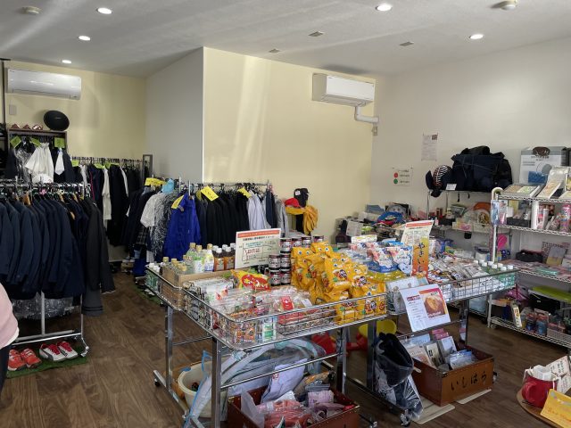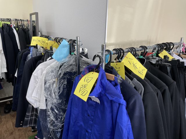 店内では、東広島市内の小中学校の制服を取り扱っています。無償で提供いただいたリユース品を300円~2000円で販売しています。新学期が始まるこの時期、サイズアウト、転入時、洗い替えなどにいかがでしょうか。