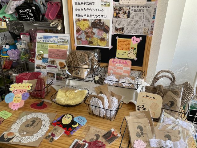 東広島市八本松町原の女子少年院「貴船原少女苑」の手芸品も販売しています。テーブルクロス、コースター、ポーチ、アクセサリーなど、かわいらしい小物が並んでいて、とても人気があるそうです。