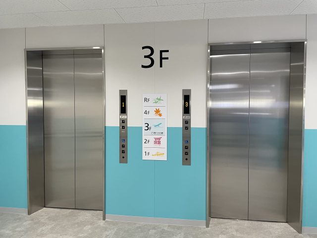 早速、入ってみます。入ってすぐにエレベーターがあります。エレベーターは連絡歩道橋に近く、荷物を持っての移動もラクそうです。