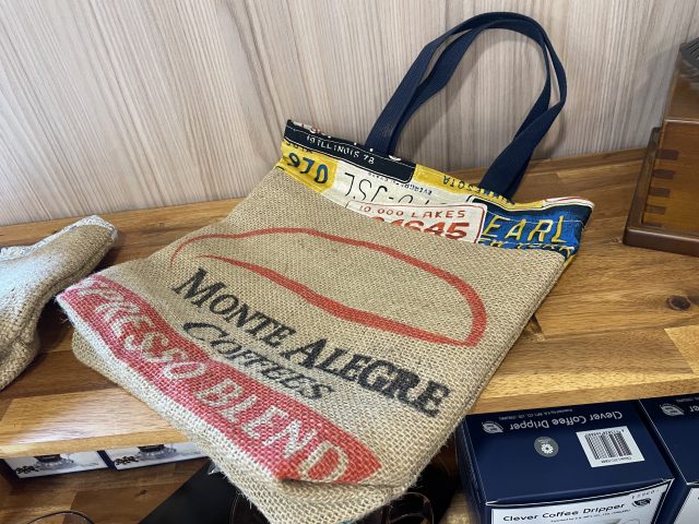 コーヒー以外にも、おしゃれで使いやすい器具や、ハンドメイド作家さんによるコーヒー豆の麻袋を使ったグッズなども購入することができます。