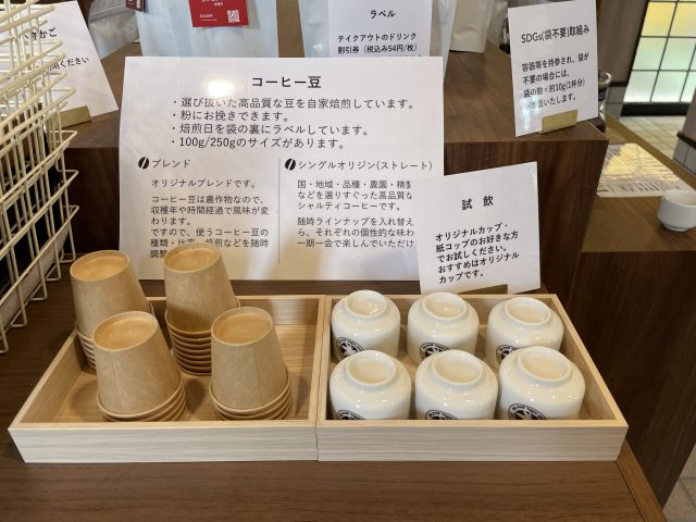 テイクアウトしたドリンクは、お店の外のミニガーデンでゆっくりと飲むことができます。コーヒー豆やドリンクについているラベルは、1枚で50円のテイクアウトのドリンク割引券にも使えるので、大切にしておいてくださいね。