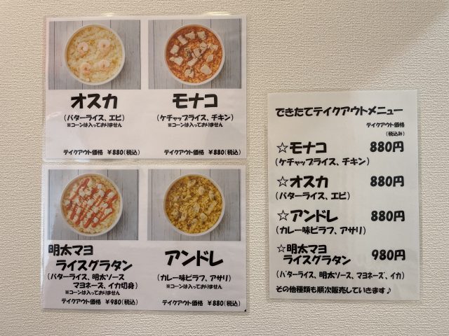 できたてテイクアウトメニューは、冷凍と同じ「モナコ」「オスカ」「アンドレ」に加えて、バターライスと明太ソース、マヨネーズ、イカの「明太マヨ ライスグラタン」です。
