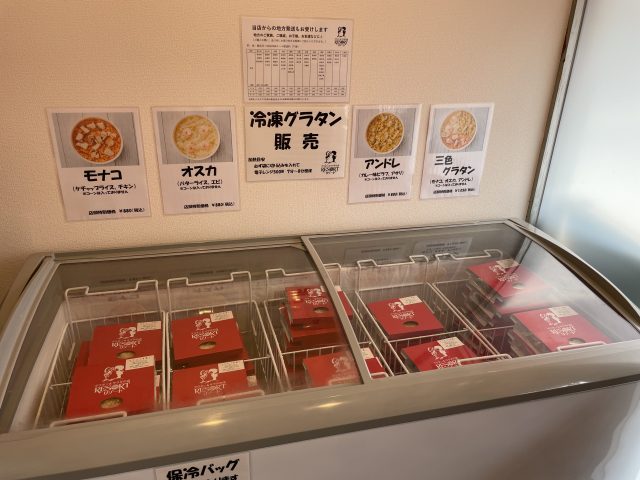 冷凍庫に入っているのは、冷凍のままテイクアウトできるライスグラタン。河内店では、リゾートの代表的な人気メニューを購入することができます。自宅でもリゾートのグラタンライスが味わう事ができるのは嬉しいですね。
