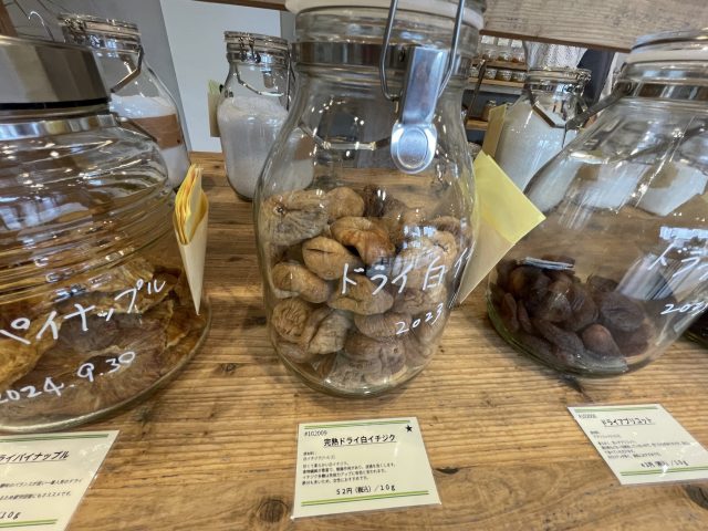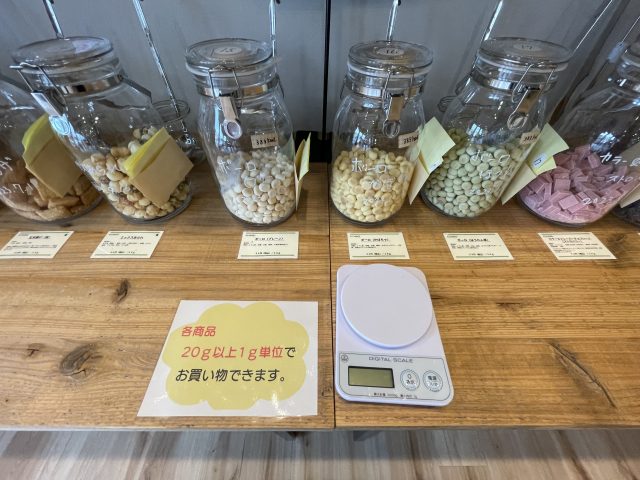 店内には、極力科学合成添加物を使用していない安心安全な商品が並んでいます。20gから1g単位で欲しい量だけ購入できます。