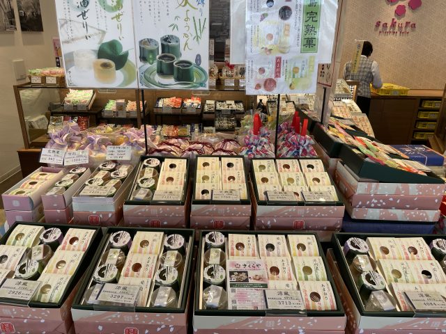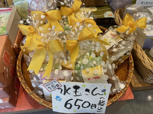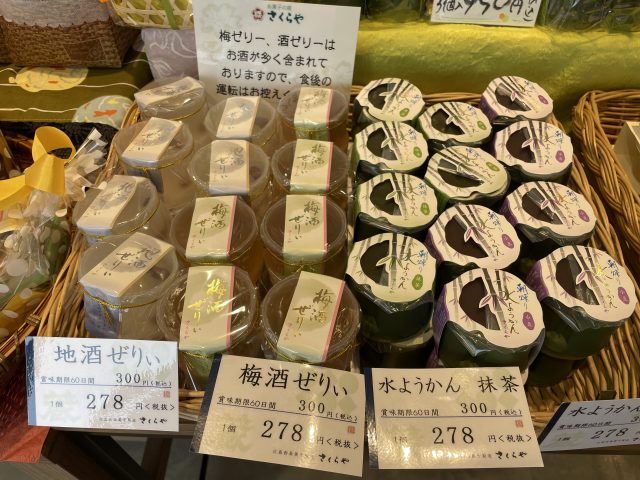 梅ゼリーと、酒ゼリーはお酒が多く含まれているそうで、「食後の運転は控えてください」と店長の元石さん。酒都東広島らしいお菓子ですね。水ようかんは、竹筒のデザインの容器に入っています。ほんのりとした甘さと、するっとした舌触り。見た目にも夏らしくてオススメです。
