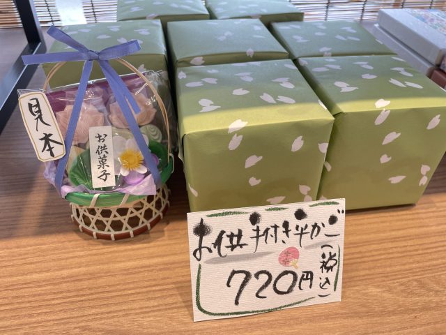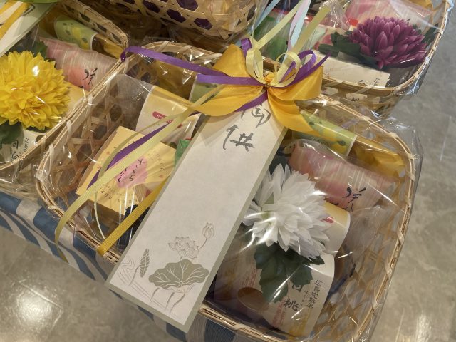 お供え用にラッピングされた詰合せも。かごの中には、花が添えられています。