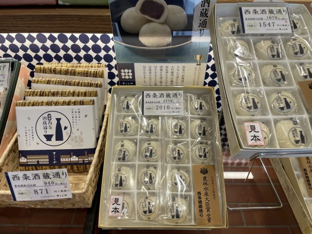 店長イチオシの定番のお菓子。酒まんじゅう「西条酒蔵通り」。東広島のお土産にも喜ばれています。控えめな甘さとお酒の香りがふんわり広がる瞬間。私(筆者)も大好きです~!