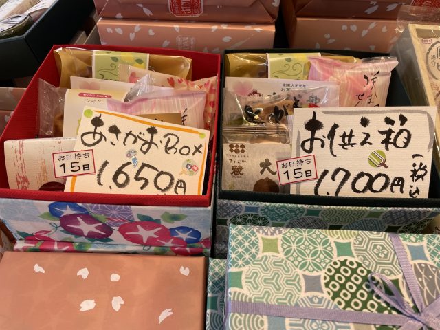 あさがおBOXと、お供え箱。ネーミングもかわいい。スタッフさん達で考えるそうです。ちなみに、筆で書かれた文字は、店長の元石さんが書いているそうです!(素敵)