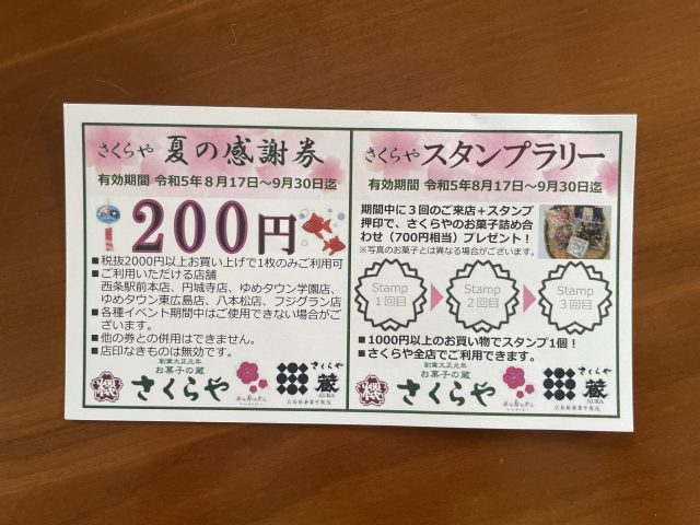 現在、お買い物いただいた方に200円の夏の感謝券と、700円相当のお菓子がもらえるスタンプラリー券を先着10000名様に配布中!この機会にぜひご利用くださいね。