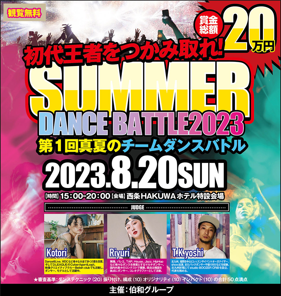 この夏、熱い戦いが繰り広げられる『SUMMER DANSE BATTLE2023』第1回真夏のチームダンスバトルを西条HAKUWAホテル敷地内で開催されます。