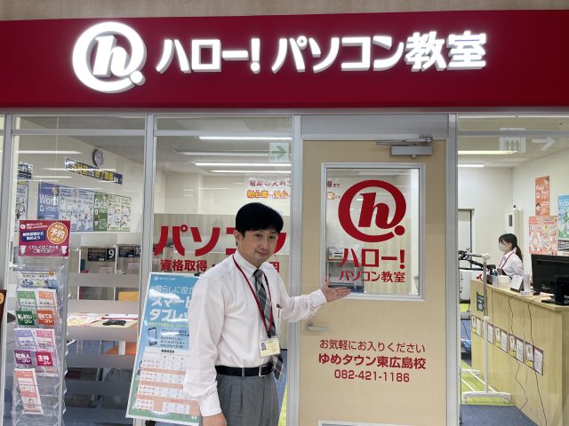 「ハロー!パソコン教室」は、全国に約185教室を展開するパソコン教室です。ゆめタウン東広島の3階という立地で、アクセスバツグンです。