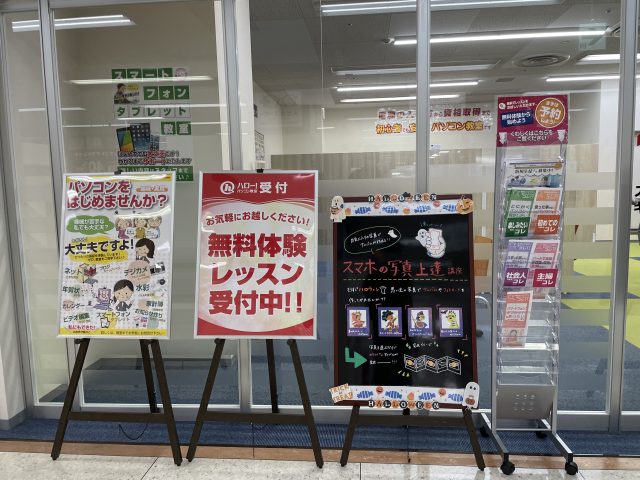 教室のインストラクターが、質問や、学習計画を親切・丁寧にサポートします。パソコンや、スマホ・タブレットに関して、分からないことがある方、始めたいけど一歩が踏み出せない方、もっと詳しく説明を聞いてみたいなど、お気軽に相談してみてください。チラシ・パンフレットなどは教室の前にありますので、是非手に取ってご覧ください。