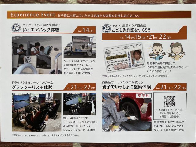 親子でいっしょに整備体験(要予約)は、実際に西条店の整備工場でプロに教えてもらいながらの整備体験会。しかも、つなぎを着用しての体験。良い記念にもなりそうです。他にも、幅広い年齢の方が楽しめそうな。ドライブシュミレーションゲーム「グランツーリスモ体験」も気になるところです。