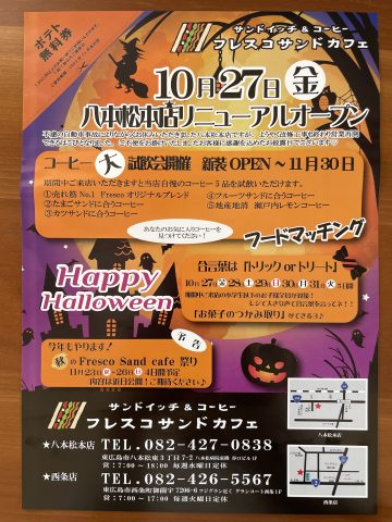 サンドイッチ&コーヒーのお店「フレスコサンドカフェ八本松店」は、店舗改修工事のため、しばらく休業していましたが、10月27日(金)、待望のリニューアルオープン!早速お店へ行ってきました。
