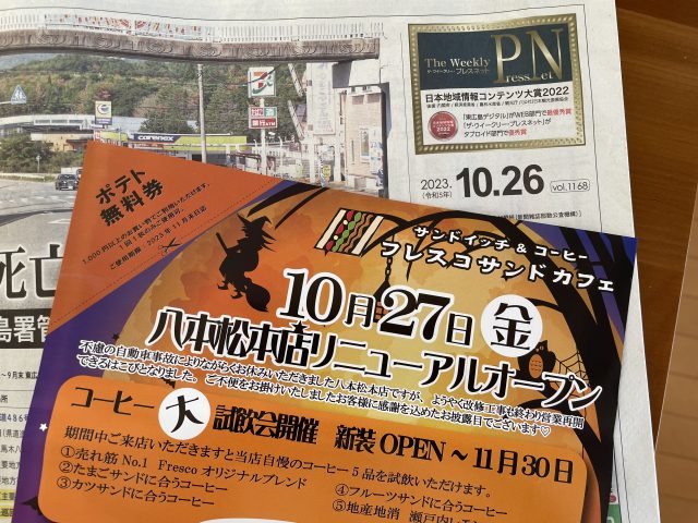 プレスネット10月26日号のプレスネットの折り込みに入っている、フレスコサンドカフェのチラシは要チェック。左上に「ポテト無料券」が付いていますよ! ※1000円以上お買い上げで利用可能。2023年11月末日まで有効。