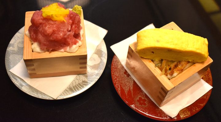 「まぐろと山芋の升寿司」はまぐろが柔らかく、山芋のトロトロ感とマッチしてすごくおいしかったです。「煮穴子とたまごの升寿司」は煮穴子とたまごがどちらも甘く、お子様にもおすすめ。