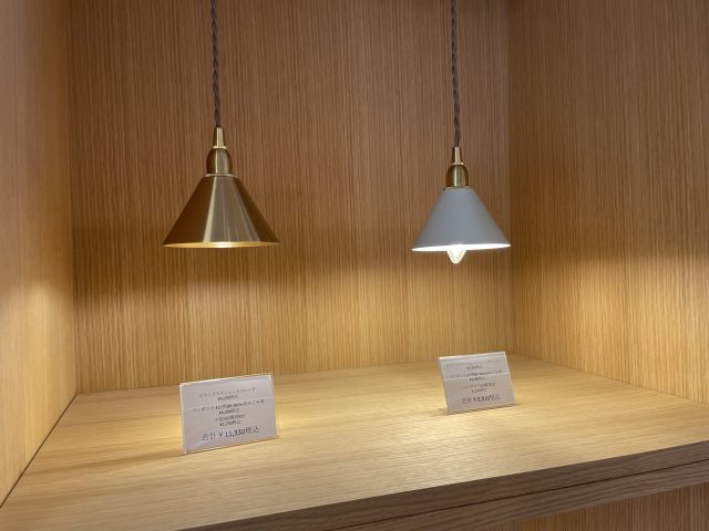 店内にはいろんなデザインの照明が吊り下がっています。バラバラなのに、どれも木と馴染んでいて和室にも洋室にもマッチしそう。店舗では実際に点灯している状態で見ることができるので、購入後のイメージがしやすいのも嬉しい。