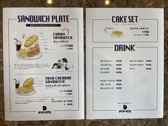 他にも、定番のツナチェダーチーズサンドや、バナナケーキ、ドリンクなどが楽しめます。