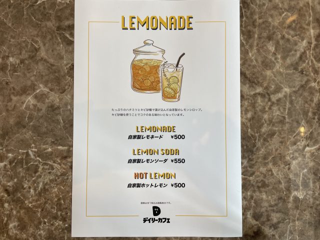 たっぷりのハチミツとキビ砂糖で漬け込んだ自家製のレモンシロップでつくる「自家製レモネード」もオススメです。レモンの甘みもしっかり味わえるレモネードは、まろやかでスッキリ。ドライブやちょっと一息入れたいときにピッタリ!