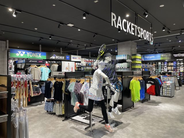 硬式テニス、ソフトテニス、バドミントンなど、各種ラケットスポーツ用品が揃っています。ラケットやシューズはもちろん、魅力的なウェアもたくさん!躍動感あるマネキンが着ているので、コーディネートのイメージがしやすいのも嬉しいですね。