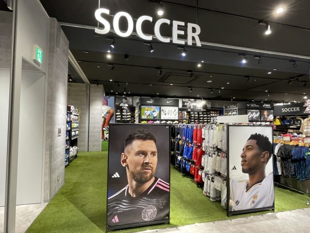 ピッチをイメージして人工芝を敷き詰めたサッカーコーナー。MIZUNO・NIKE・asics・adidas・