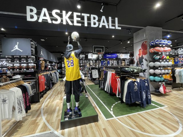 実際に使用するイメージができるよう、中央にバスケットゴールを置き、床はコート仕様。臨場感のある売場です。注目度の高いNIKE・JORDANなどの人気ブランドやオリジナルの商品を取り扱っています。