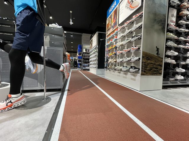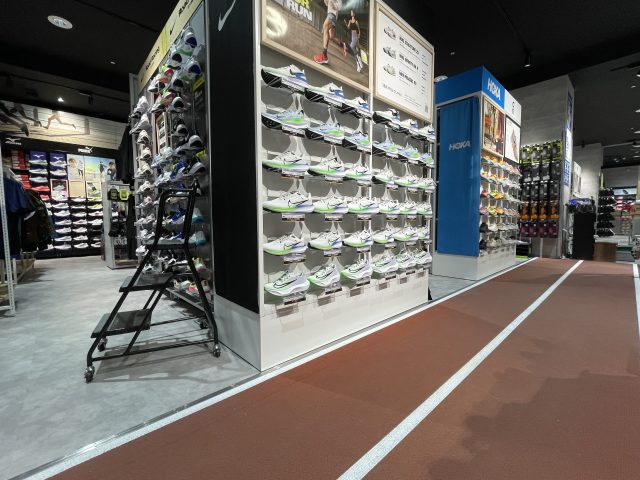 人気ブランドはじめ、取り扱いブランドやバリエーションが豊富。売り場は実際に手に取り、履いてフィット感などをチェックできるのはもちろん、広島初!新国立競技場と同じ床材を使ったトラックの一部を再現したエリアで本格的なグリップ感を体感できるそうです。