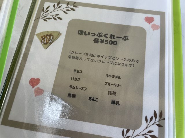 「ほいっぷくれーぷ」は、クレープ生地にホイップとソースのみのクレープ。抹茶ソースや、黒蜜、あんこなど、和菓子風トッピングを選んでもおいしそう♪