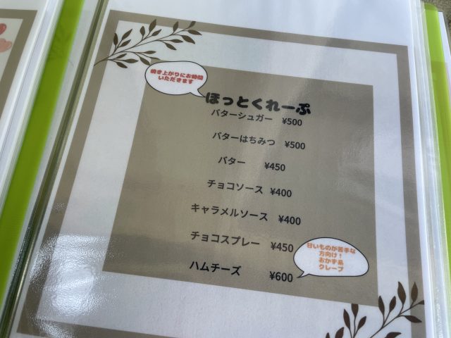 生地をカリっとした食感に焼いた「ほっとくれーぷ」は、バターやソースが浸み込んだ生地がたまらなくおいしいそうです。甘いものが苦手な方には、食事系のクレープ「ハムチーズ」もおすすめです。