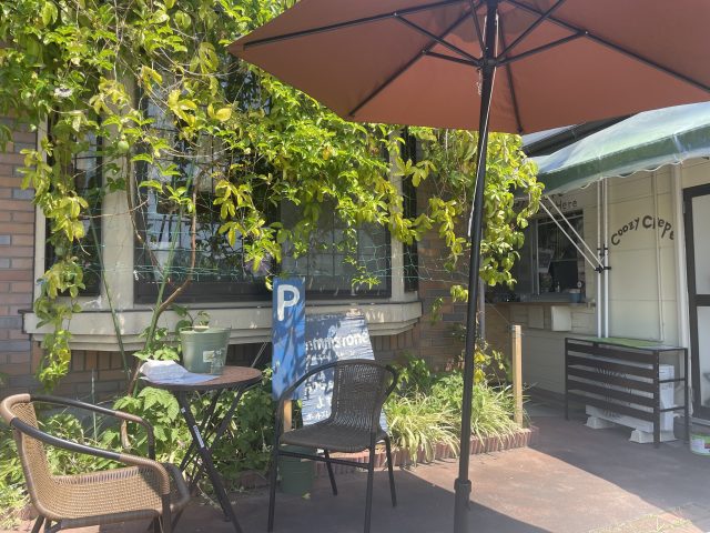 コージークレープはテイクアウト専門店ですが、店先にあるパラソルとテーブル席でも食べることもがきます。これは贅沢なシチュエーションですね。