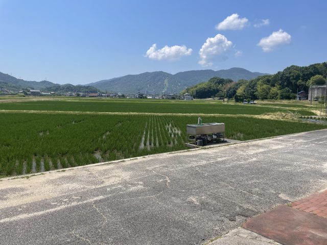 西条からは国道375号を呉方面へ。黒瀬町乃美尾、門前神社入口交差点を左折し、すぐ右折すると広がる田園風景の中にあるパラソルのテラス席が目印。