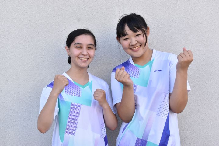 高校に入ってからバドミントンを始めたという2人。去年の全国大会では斉藤さんがシングルス、牛島さんがダブルスに出場。結果はシングルス、タブルス共に初戦敗退。牛島さんは「去年は全国大会出場が初めてだったので緊張したが、今年はリラックスして臨めそう。1、2勝できることが目標」、斉藤さんは「今年はダブルスなので2人で一緒に1勝でも取りに行きたい。試合を楽しみたい」と2人とも笑顔で目標を話していた。
