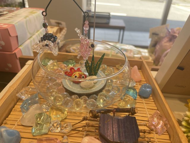 ビーズ細工の金魚と涼し気な飾りは、店舗スタッフさんの手作りです。お菓子選びの合間にふっと入ってくる愛らしい飾りにふっと優しい気持ちになりました。
