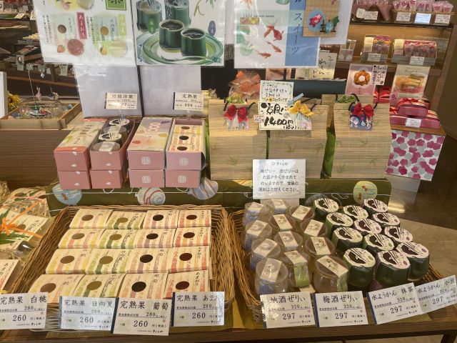 夏の人気商品は、やっぱり涼菓。特に暑いこの季節には、ひんやりとしたものや爽やかな味わいのものが喜ばれますよね。完熟果(ゼリー)は4種類。果物の味わいたっぷりのゼリーです。