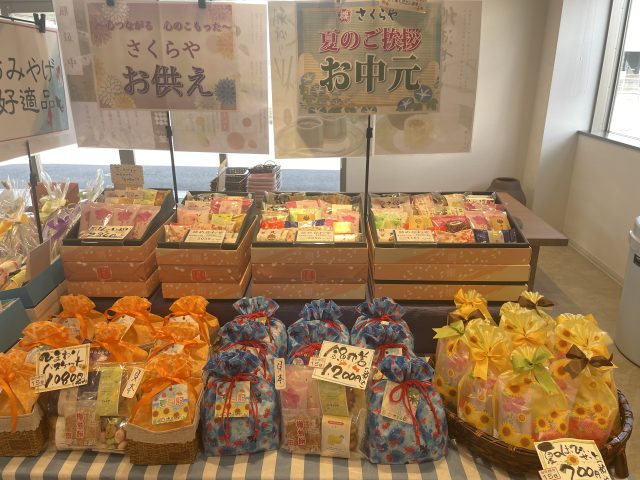 店内には、ちょっと座って休めるスペースもあるんです。夏のごあいさつや、帰省の手土産、自分へのごほうびなど、お買い物の際には、お茶でも飲んでゆっくり選んでみてください。