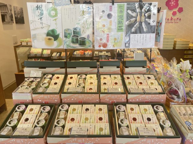 「さくらや」は東広島市内に6店舗あります。年中無休、この夏も休まず営業しています!店内には、涼し気な夏のお菓子がずらり。朝10時の「街角リポート」中継直前まで多くのお客様が訪れ、さまざまなお菓子を選ばれていました。